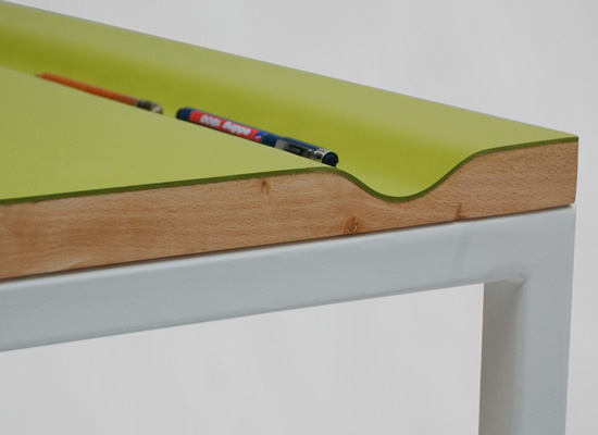 • Powder coated metal legs, uni coloured rubber writing surface with beech frame